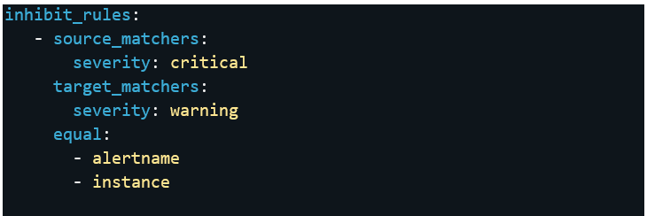 - equal: Defines a list of label names that must have identical values in both the source and target alerts for the inhibition rule to take effect.
