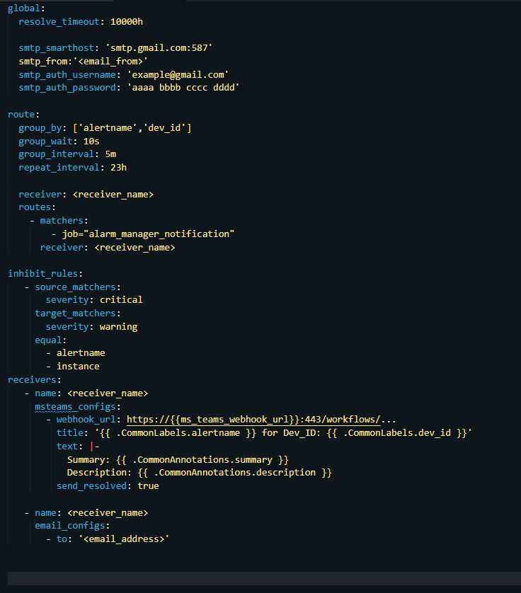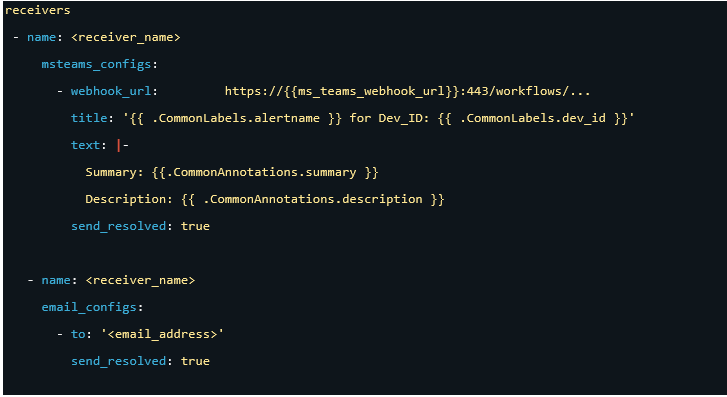 - receivers: Specifies a list of named configurations for notification integrations. This example lists a Microsoft Teams receiver and an Email receiver. Detailed instructions for configuring your receivers are found in the Receiver integration settings documentation. The text {{.CommonLabels.}} and {{.CommonAnnotations.}} are used as variable placeholders for the data found in the alert notification payload sent by Corning Everon.
