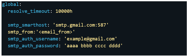 - smtp_smarthost: Defines the address and port of the SMTP server (smarthost) used for sending emails. The port number is typically 25 for standard SMTP or 587 for SMTP over TLS (STARTTLS). This setting is essential for configuring the email notification system to relay messages through the specified SMTP server. Example: smtp.example.org:587