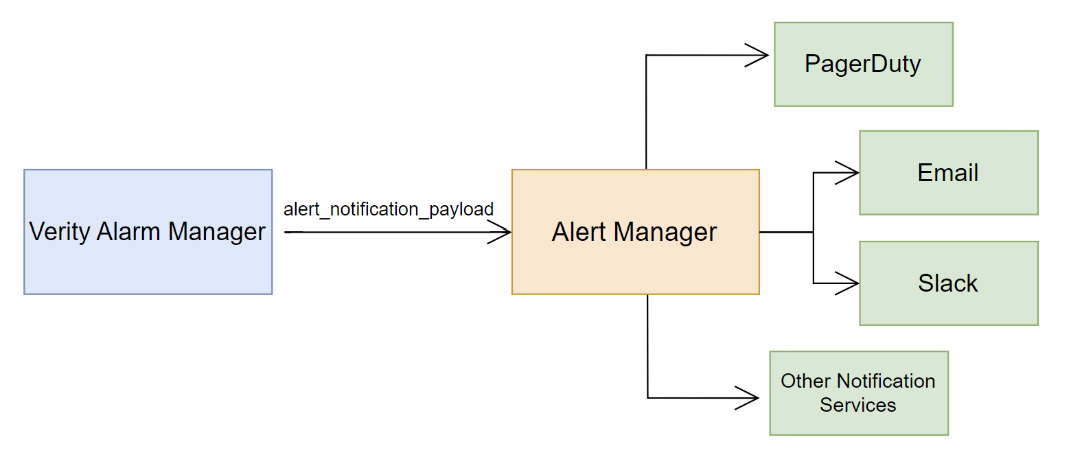 The following diagram represents the relationship between Corning Everon Alarm Manager, Alert Manager, and an arbitrary collection of connected messaging services.