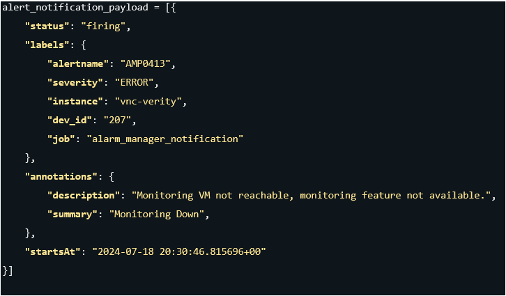 When an alarm is triggered an alert notification payload is sent to the Alert Manager. Below is an example of what the alert notification payload contains. This information is used in the notifications sent out by the Alert Manager, which will be explained in more detail later.