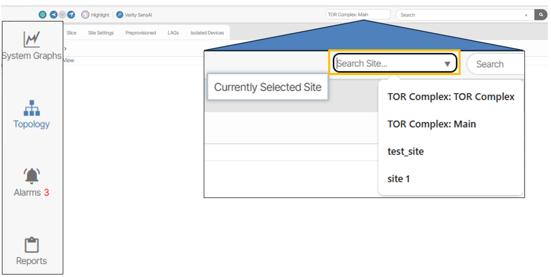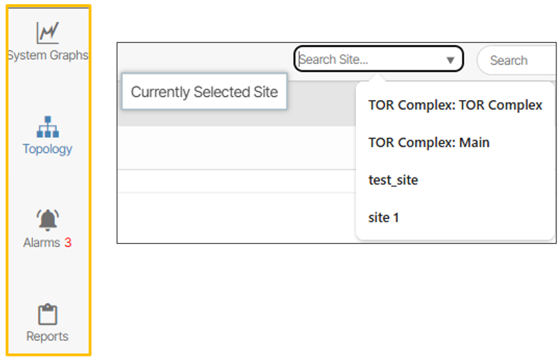 The content presented by clicking the System Graphs, Topology, Alarms and Reports navigation menus will update to reflect the configuration of the currently selected site.
