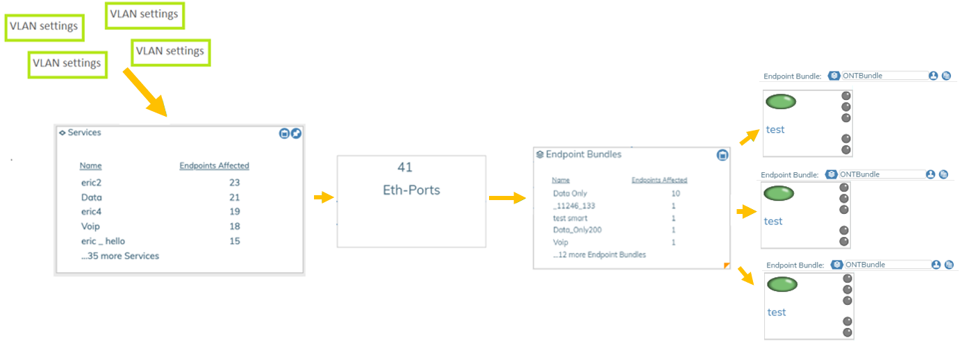 A Bundle is a group of settings used to configure, program and set the state of a switch or ONT. A GUI instance can have many bundles (hundreds) each for a different switch. Ideally, you will have one bundle for many ONT's. Bundle assignment is part of the provisioning process and all devices require a n assigned Bundle. The following bullet points describes the relationship between settings and a Bundle.