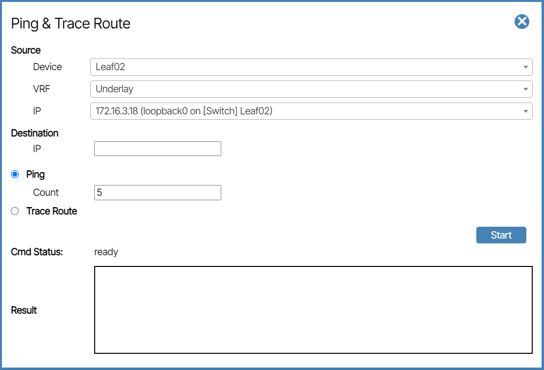 - IP: The targeted IP address to send the ping command from. The IP address changes depending on the VRF setting.
