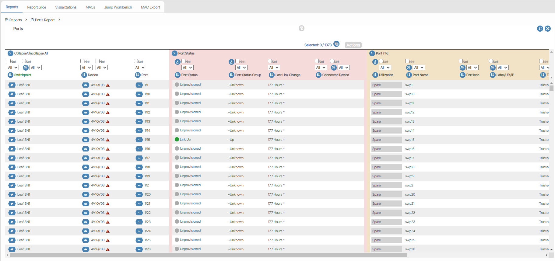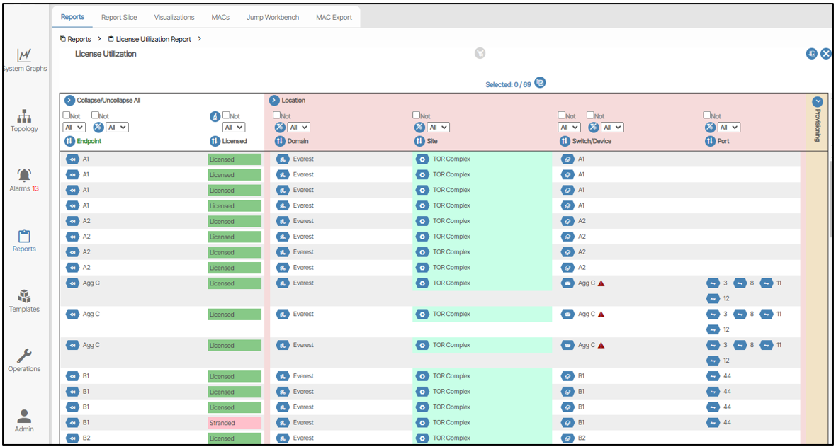 By clicking on the report icons for License Utilization, License by Device Utilization, and Physical Port Utilization, a report for those lists will be shown. For a specific report on used, preprovisioned, stranded, or spare licenses, the user can click on each section of the bar graph. This can also be done with physical ports that are licensed, fabric or spare.