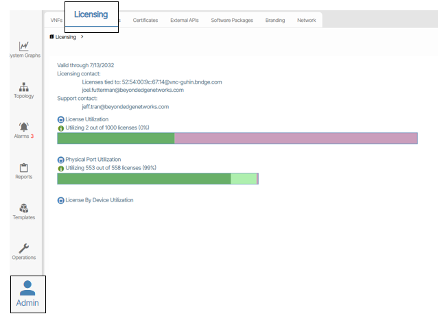 The Licensing object displays License Usage and Physical Port Usage bar graphs. While focused on the object, the user can see the date of licensing expiration, contact information for support, and reports of license.