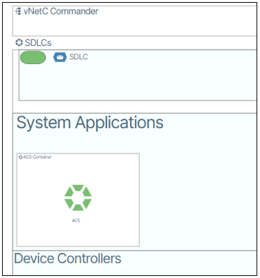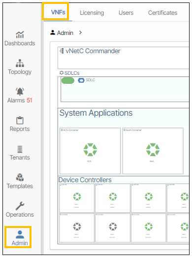 - When the window appears the initial state of System Applications are offline. When the System Applications come online their LED icons render green. This may take up to 5 minutes. Admin/VNFs