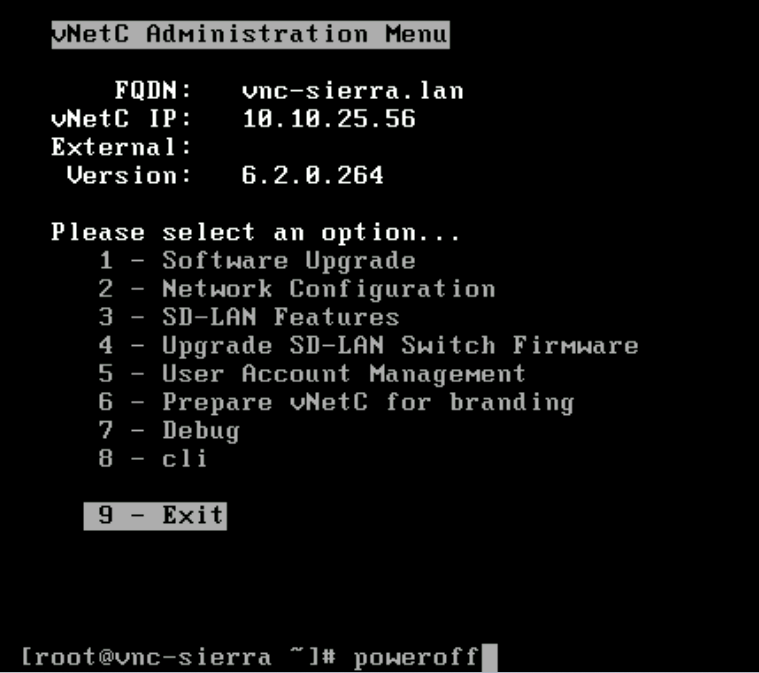 - At the login prompt enter username admin and the administration password configured in the menu during installation. These are the credentials you entered in step 3 of Configure the vNetC from the Console.