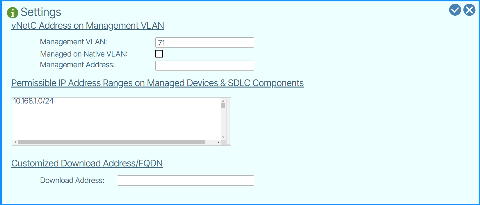 Set up the Management VLAN used to access the Management network. This field is required even if your management switches are untagged connections. Note: If untagged select “Managed on Native VLAN” checkbox.