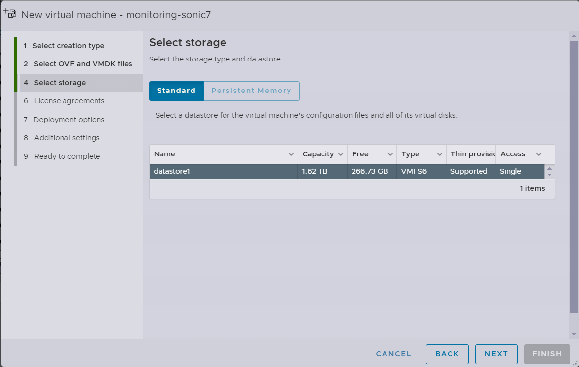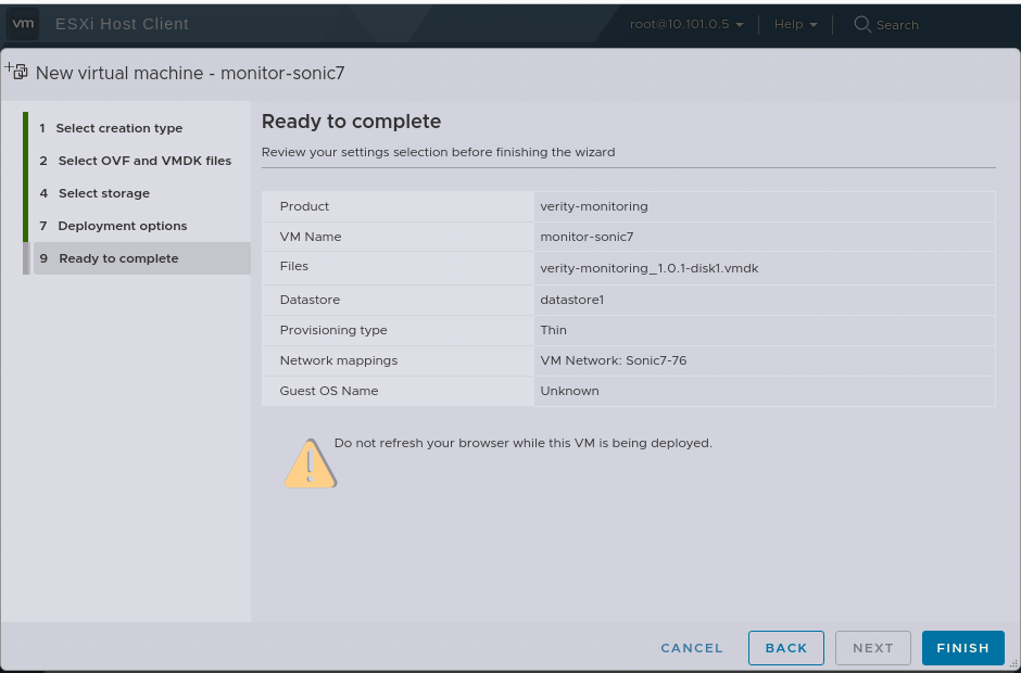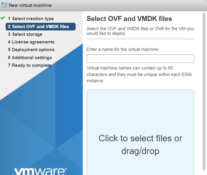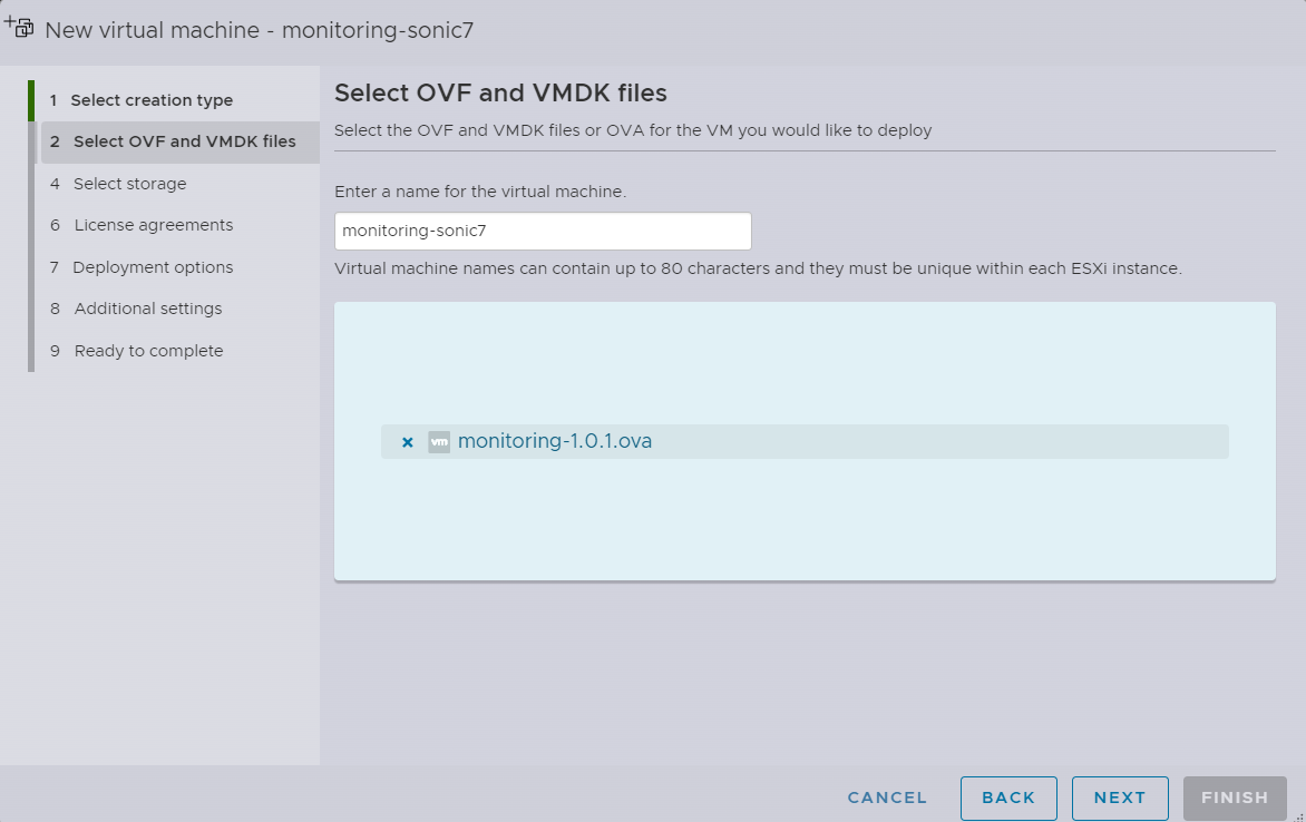 - Enter a name for the VM and upload the Monitoring VM OVA file via the prompt that says Click to Select file or drag/drop.