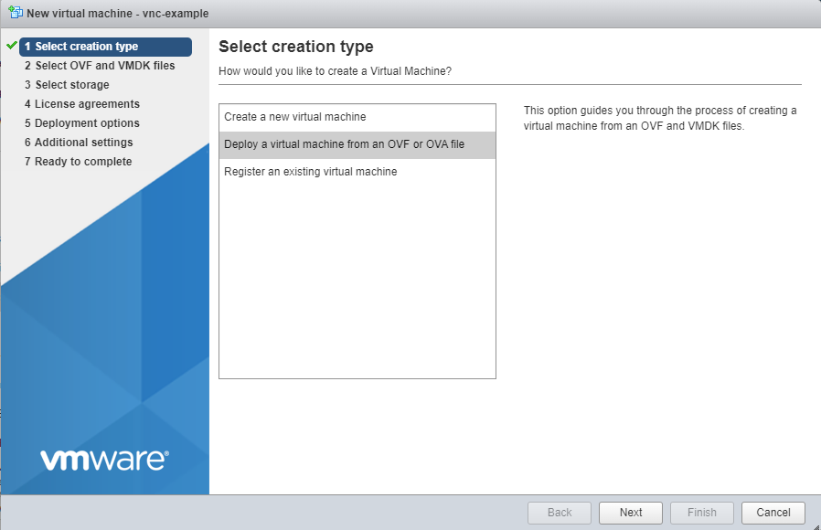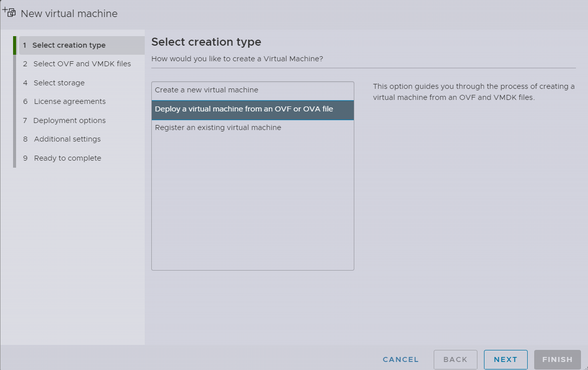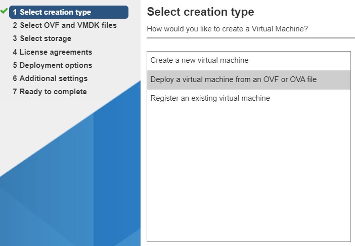 - In the window that appears select Deploy a virtual machine from an OVF or OVA file.