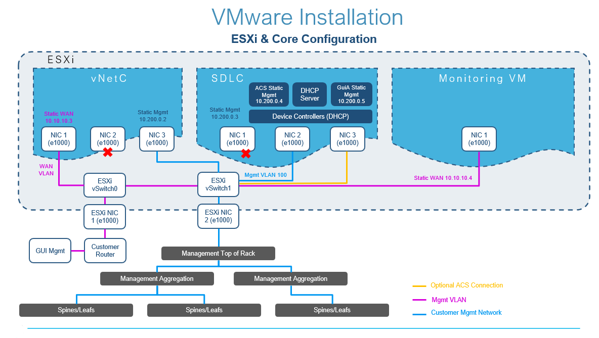 The following diagram shows the recommended management network architecture. Variations are possible based on individual customer’s network needs.
