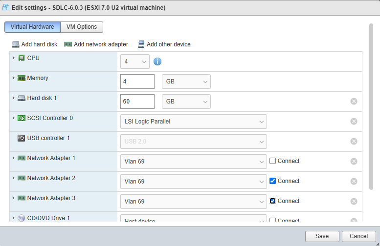 In cases where the system is installed without Device Controllers, it is possible to use default VMWare security for the SDLC interfaces. In this case, an extra connection from the SDLC VM is used for the ACS. If not using this case, then skip the following instructions and resume with Network Configuration in step 11.