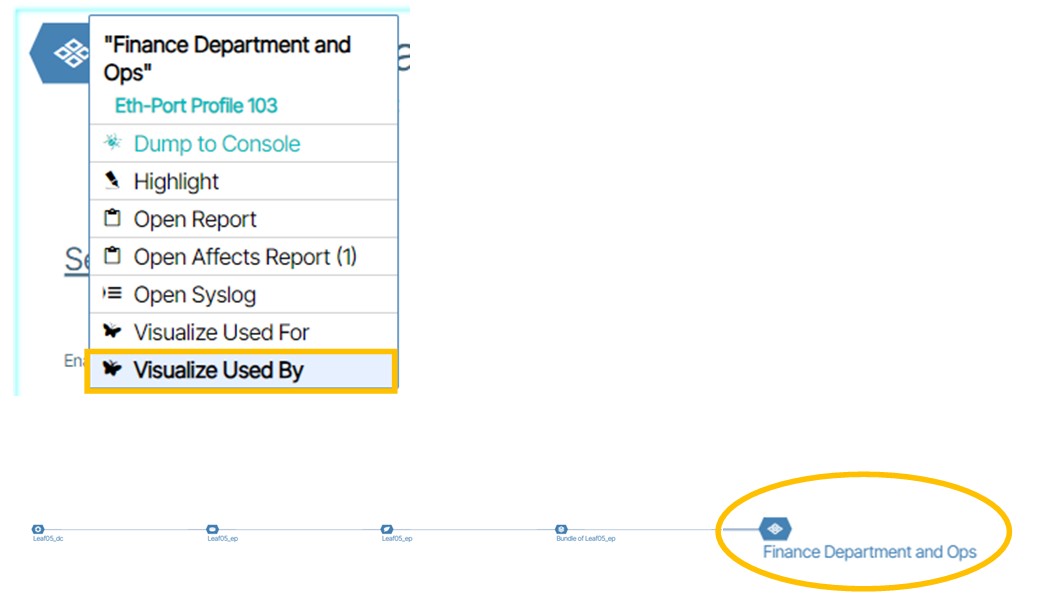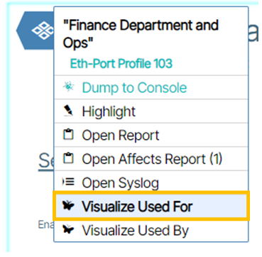 In this example Visualize Used For is selected on an Eth-Port-Profile named Finance Department and Ops.