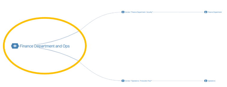 In the diagram below, the object representing the Eth-Port Profile named Finance Department and Ops is rendered to the far left of the diagram and is composed of the objects to the right of it.
